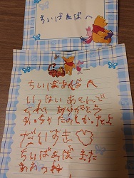 あと数日でばあばは帰ります。と話すと、お手紙書くと言って書いてくれてた。普段は書くということに興味がないらしく、思っていることをしゃべってもらい娘がえんぴつで薄く書き、それをなぞるという方法で書き上げたらしいです。一気に書き上げたのを見てじっと書いてられるようになったんや~とビックリしていた。帰ると言ってからは、あと少しやからとくっついてくる。なんともかわいいやん。